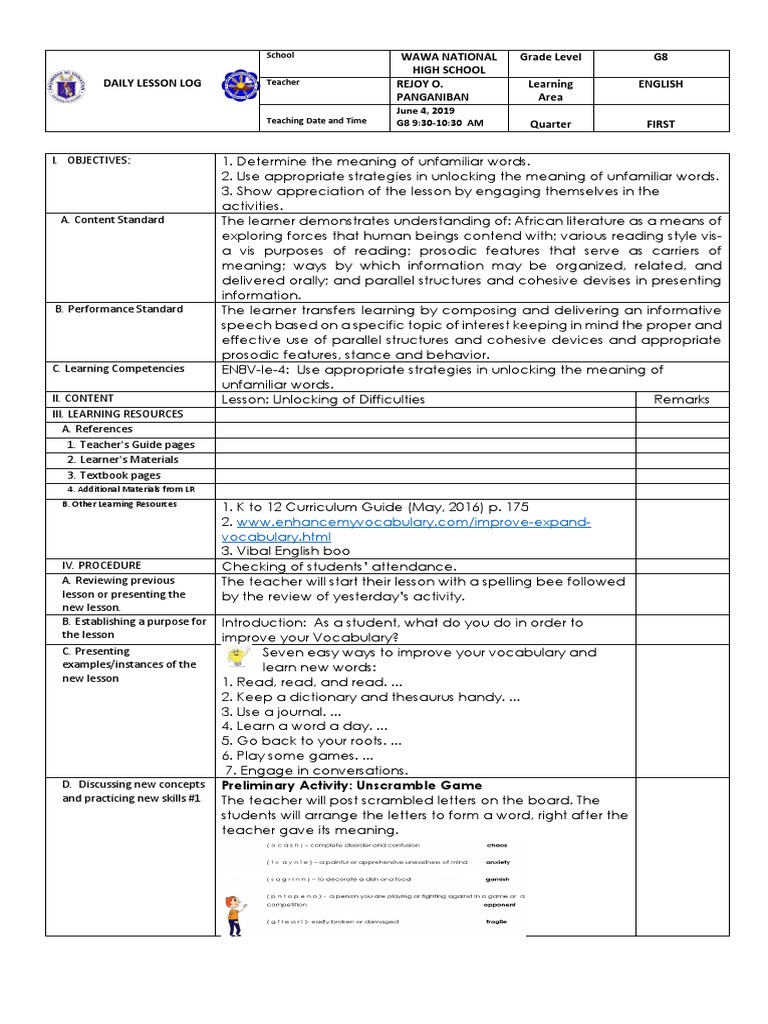 17 Elementary Lesson Plans Ideas Elementary Lesson Plans Lesson Plan Examples 4a S Lesson Plan from i.pinimg.com Feb 07, 2011 · depending on your choice, you can unlock your cell phone in a cheap and simple way. The sentences have context clues to help them determine the correct answer. Students will use a word key to fill in the blanks of missing vocabulary words in sentences. See more ideas about activities, activity games, games for kids. The diaper was just the right snug around the baby's waist. Feb 07, 2013 · unlocking of difficulties ask the students to read the following sentences and then let them determine the meaning of the underlined words through context clues. Contextual translation of activities for unlocking of difficulties into tagalog. There are various cell phone unlocking service providers that can help you to unlock your cell phones.